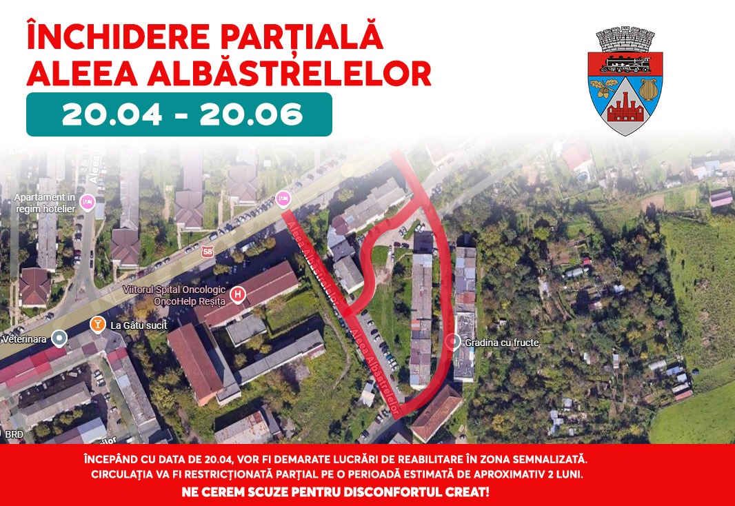 Circulația pe strada Albăstrelelor din municipiul Reșița va fi restricționată parțial începând de luni, 20 aprilie 2026, ca urmare a unor lucrări de reabilitare și modernizare desfășurate în zona semnalizată.